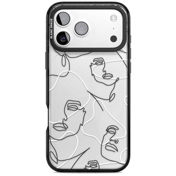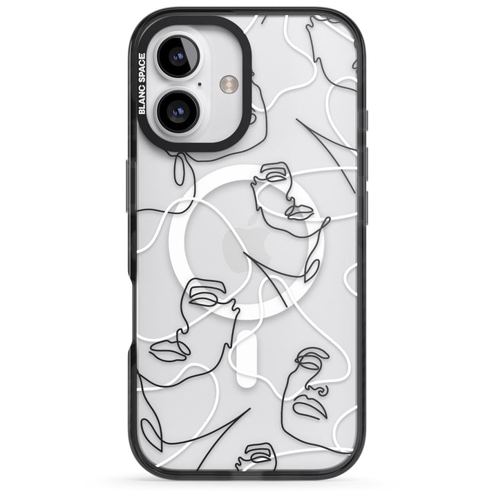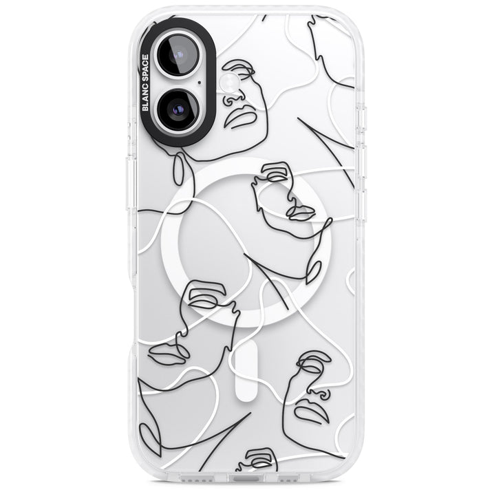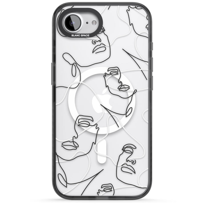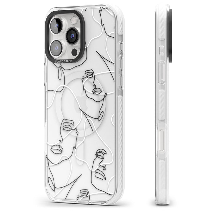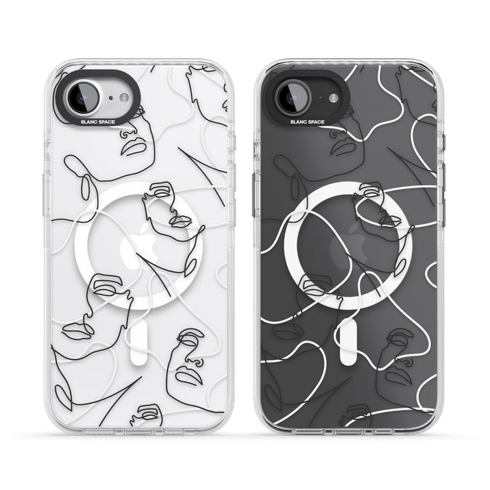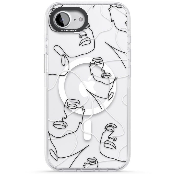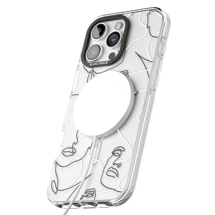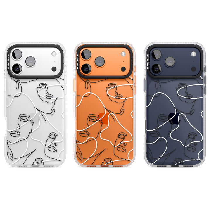 It features an abstract face line art design layered over soft blush, beige, and coral color blocks, combining artful aesthetics with practical functionality.