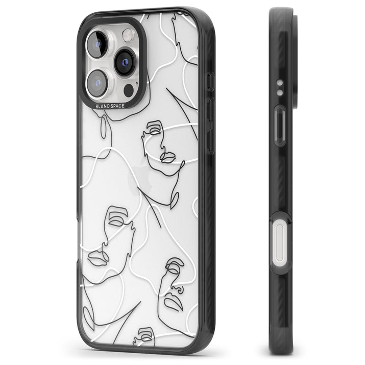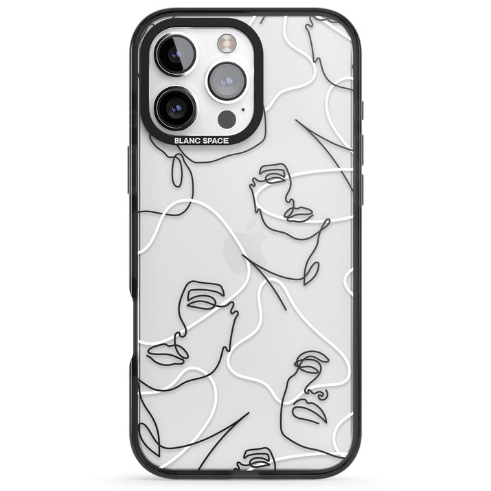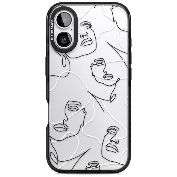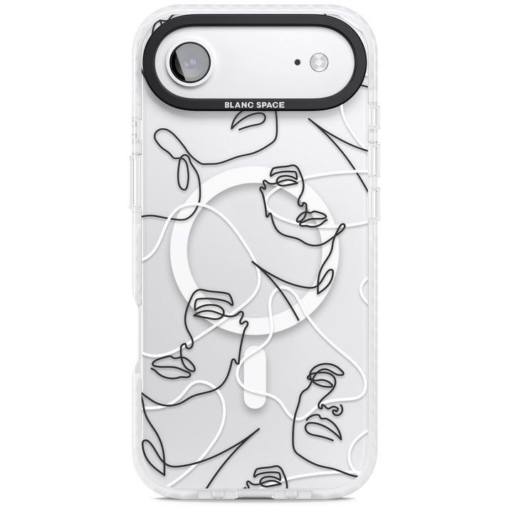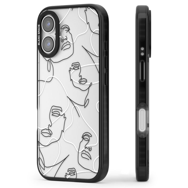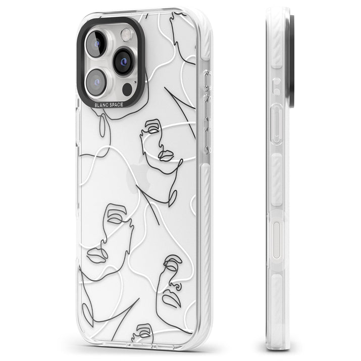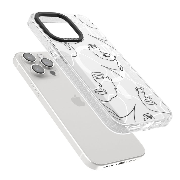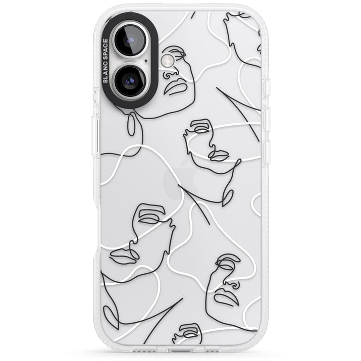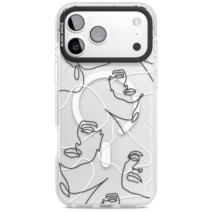 It features an abstract face line art design layered over soft blush, beige, and coral color blocks, combining artful aesthetics with practical functionality.