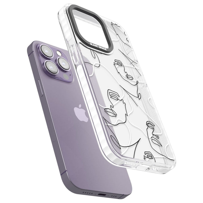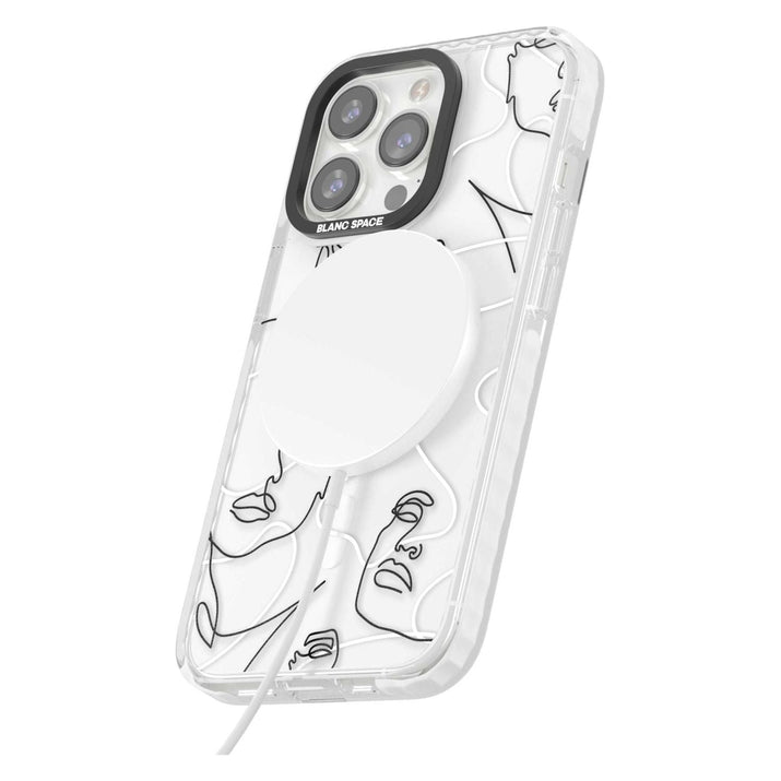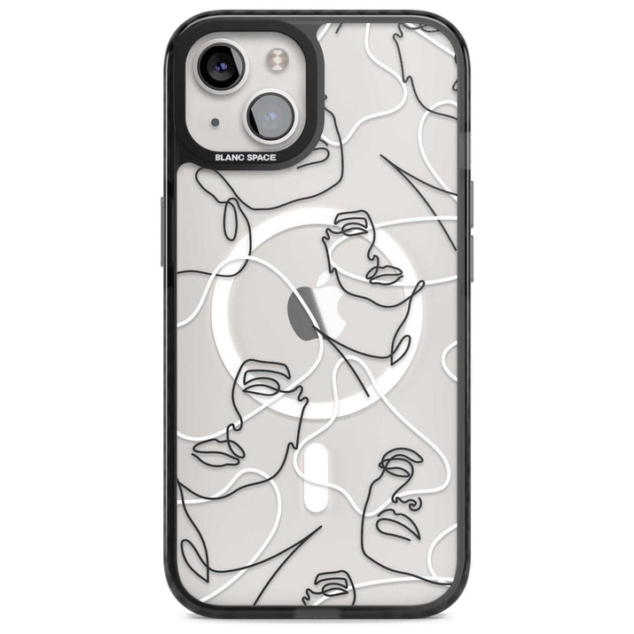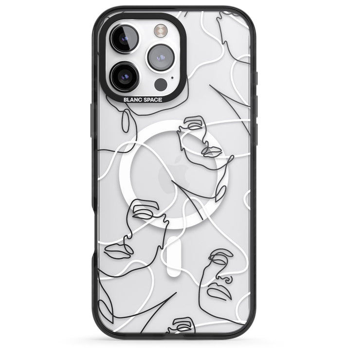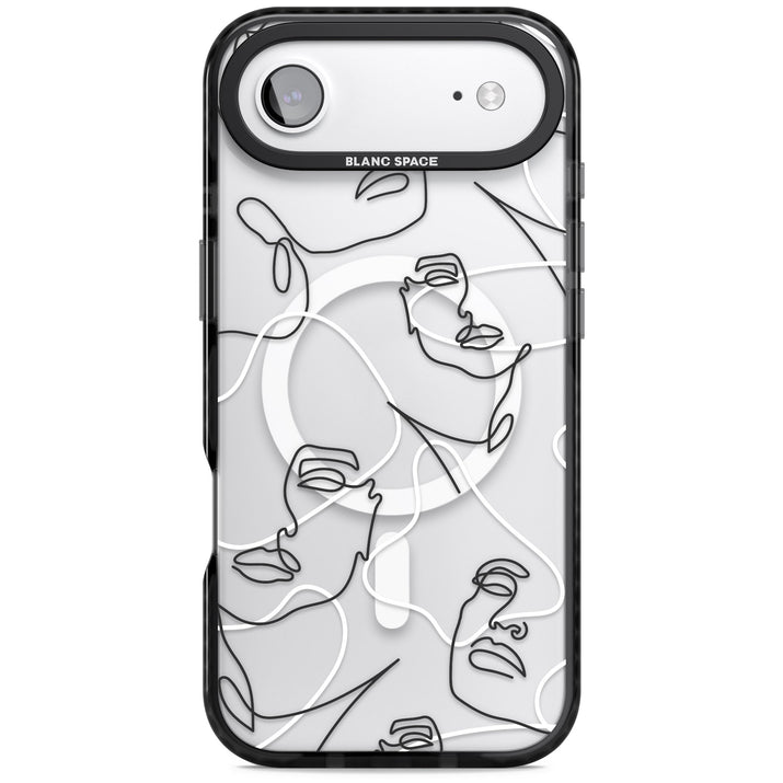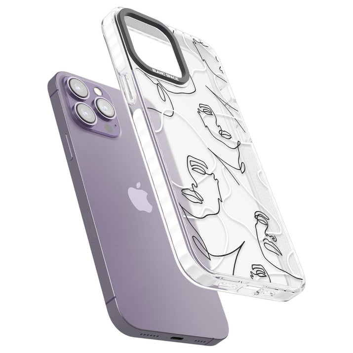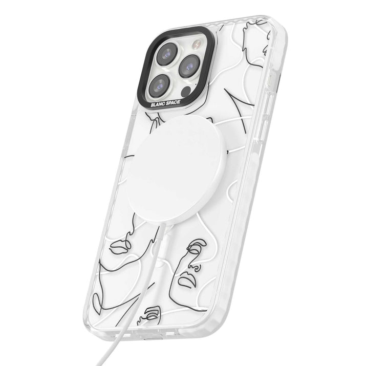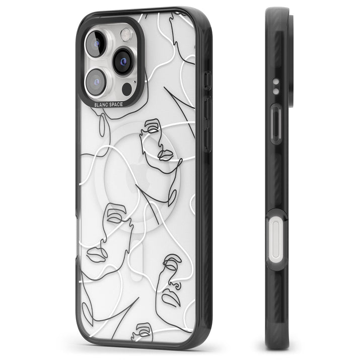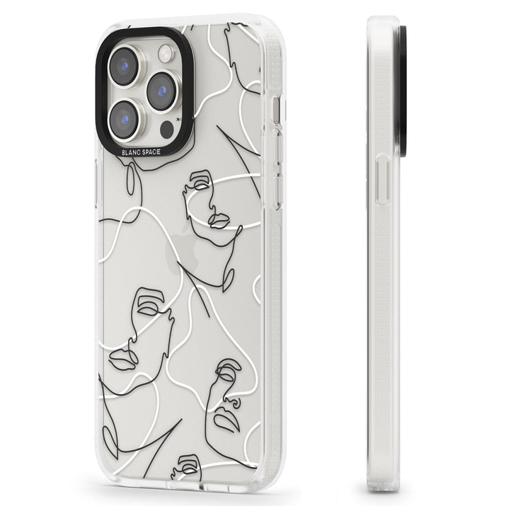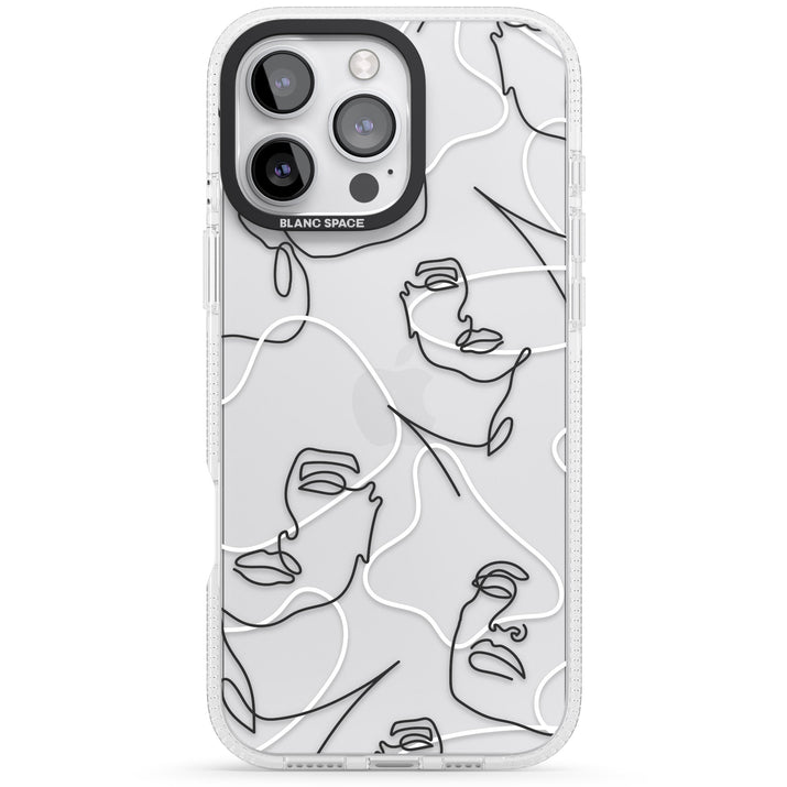 It features an abstract face line art design layered over soft blush, beige, and coral color blocks, combining artful aesthetics with practical functionality.