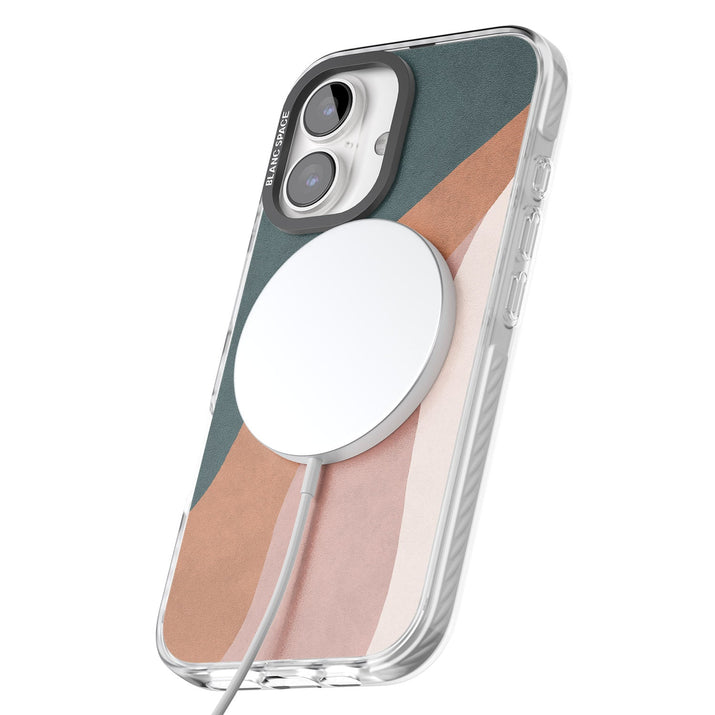 It features an abstract face line art design layered over soft blush, beige, and coral color blocks, combining artful aesthetics with practical functionality.