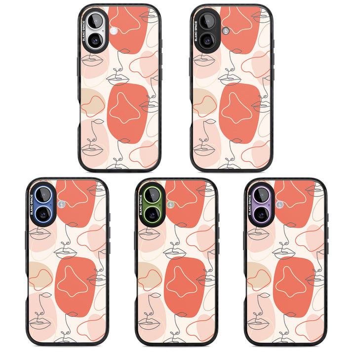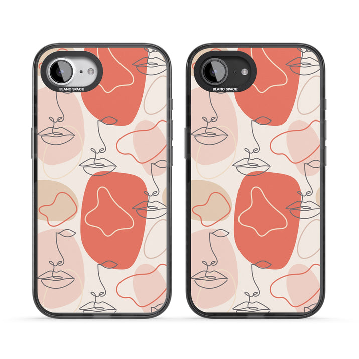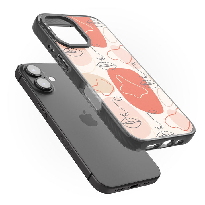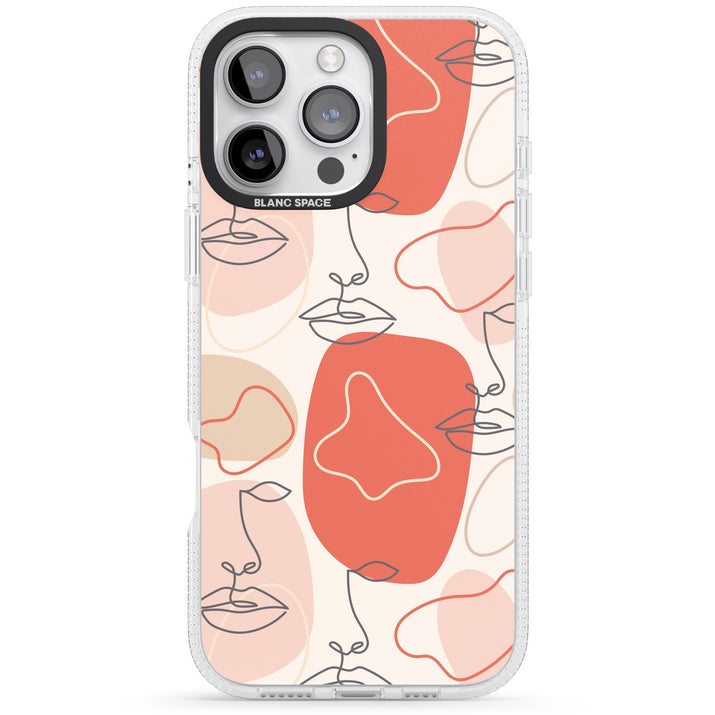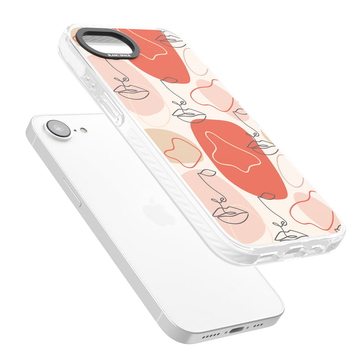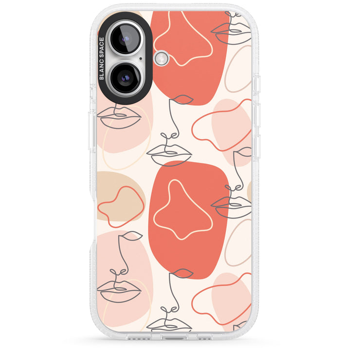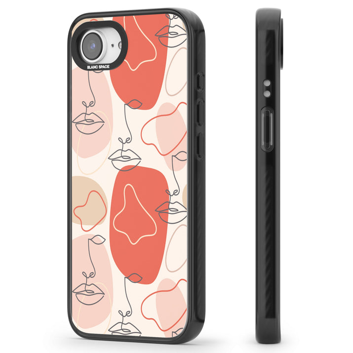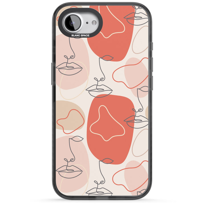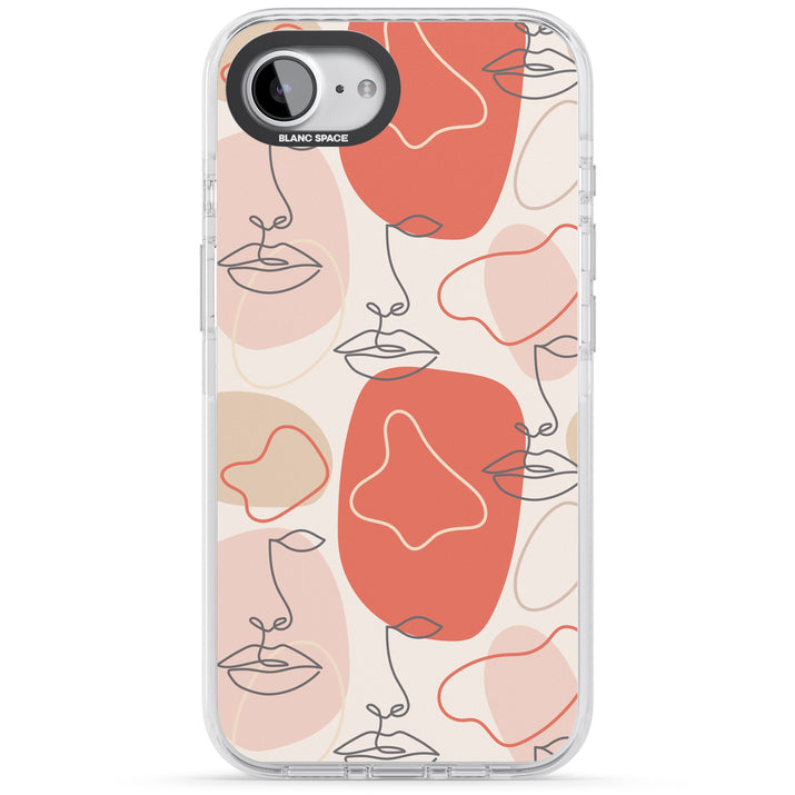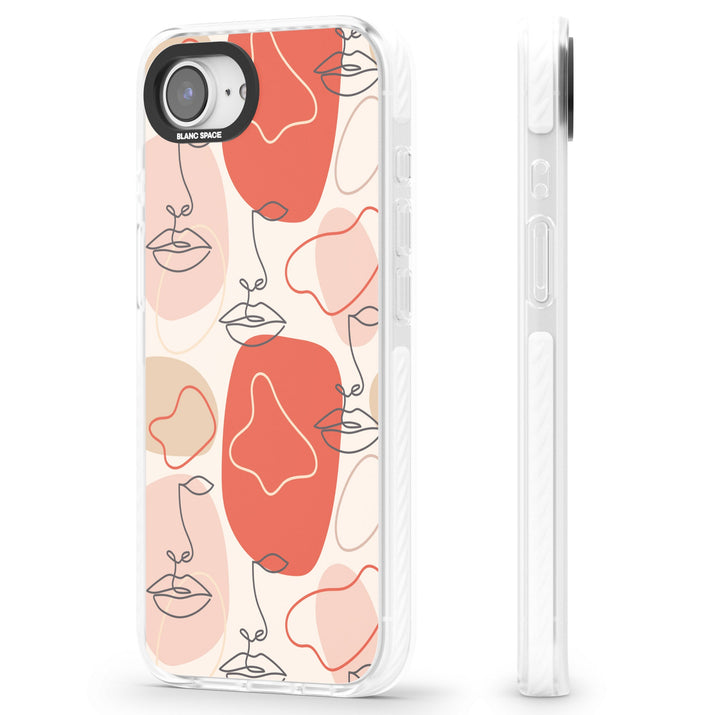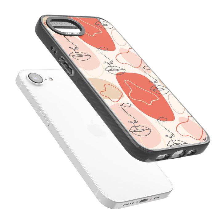 Den har en abstrakt ansiktslinjekonstdesign lager över mjuka rouge-, beige- och korallfärgblock, som kombinerar konstnärlig estetik med praktisk funktionalitet.