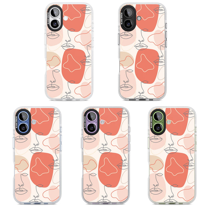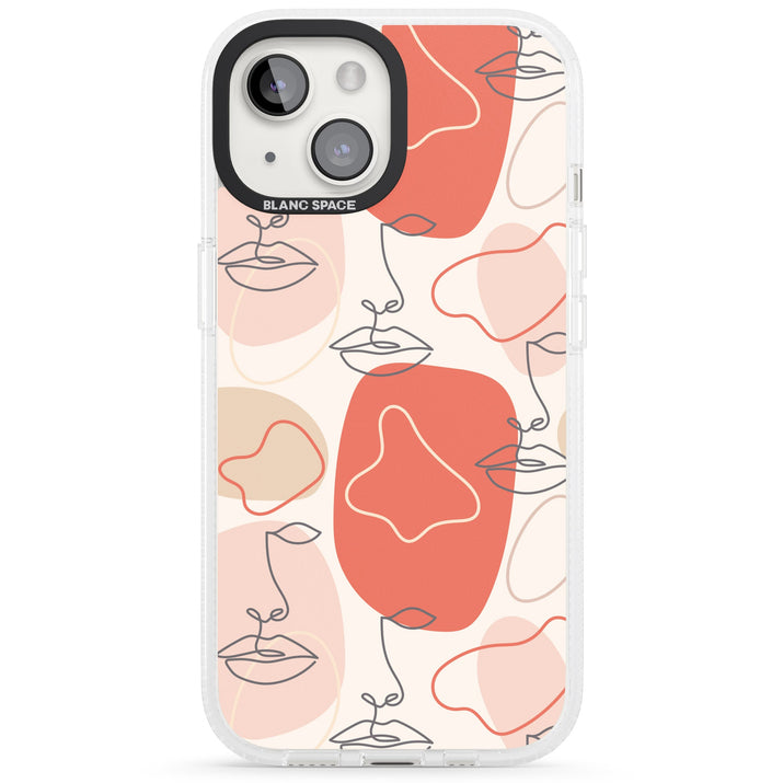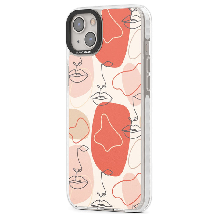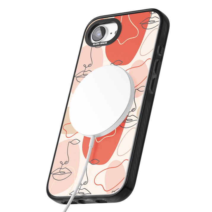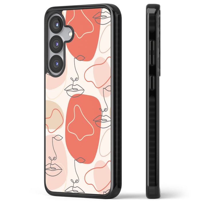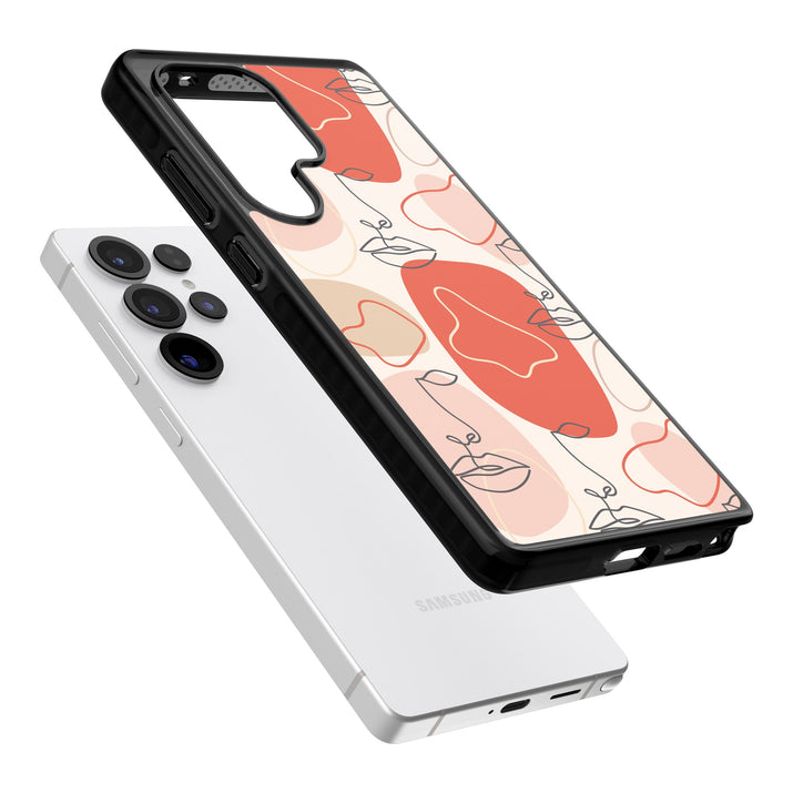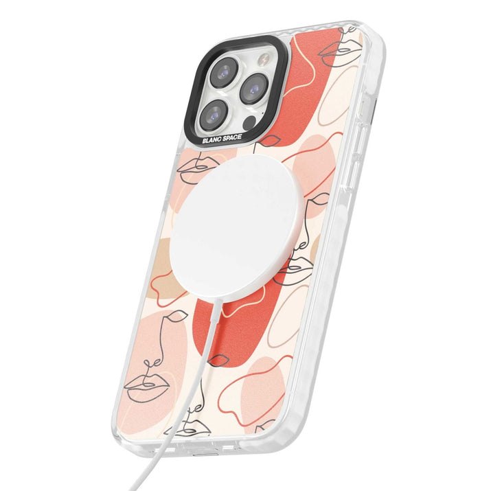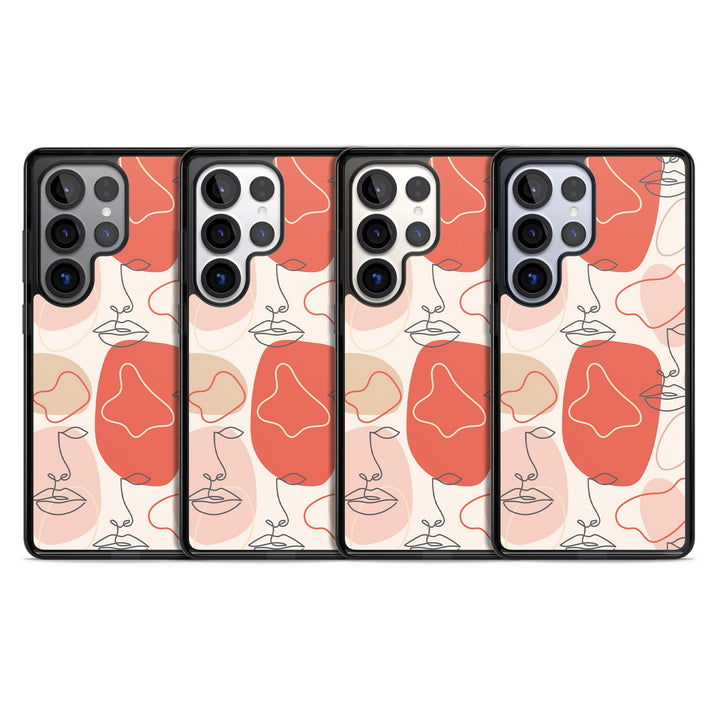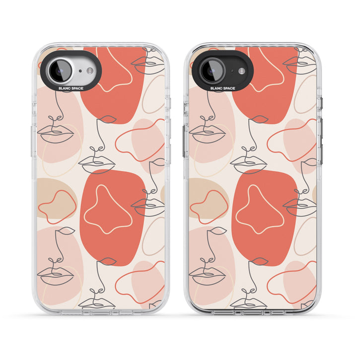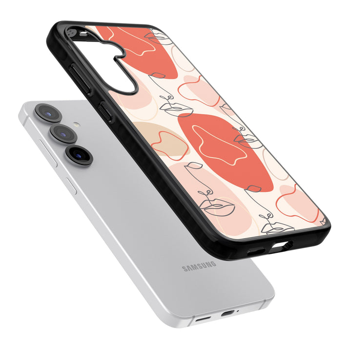 Den har en abstrakt ansiktslinjekonstdesign lager över mjuka rouge-, beige- och korallfärgblock, som kombinerar konstnärlig estetik med praktisk funktionalitet.